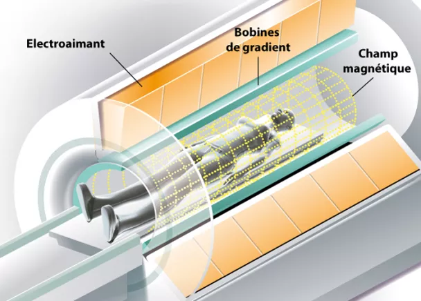 La machine d’IRM se compose principalement d’une sorte de tunnel formé d’un aimant à l’intérieur duquel coulisse une table d’examen.
